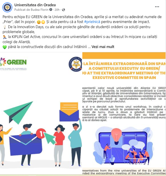 Communication Activity Name: EU GREEN_UO newsletter nr. 5, April 2024, by University of Oradea. Topics: Winners of the KIPLIN – Get Active in Campus contest, interesting details about the extraordinary meeting of the EU GREEN Executive Committee, a meeting that took place at the University of Extremadura – Spain, ideas launched by Oradea students on Innovation Days, and the most recent research calls that Oradea university members can apply for