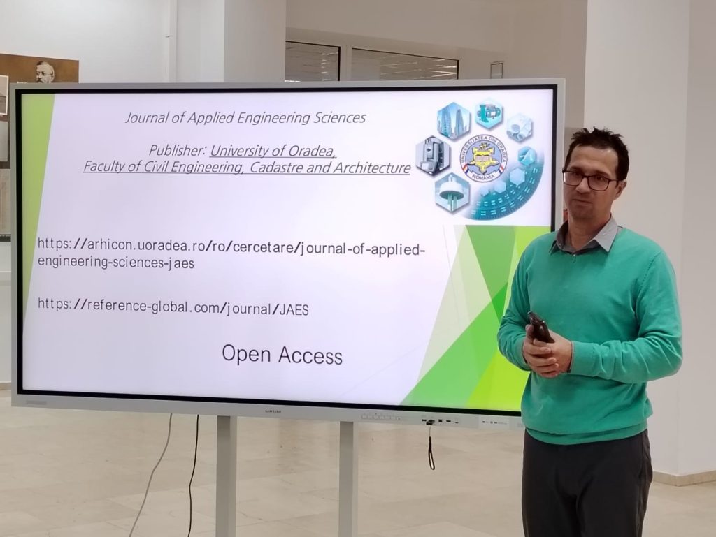 „Journal of Applied Engineering Sciences” (JAES) (ISSN: 2247-3769 / e- ISSN: 2284-7197) a fost prezentat de către prof. univ. dr. habil. ing. Sorin Nistor. Universitarul a vorbit despre traseul revistei de până să ajungă cotată în WOS. „Rezultat al muncii riguroase și meticuloase a colegei noastre lect. univ. dr. Gabriela Argentina Popoviciu, care se ocupă îndeaproape de conținutul fiecărui număr al revistei și rezultat al contribuției membrilor colectivului de ediție a revistei”, după cum a spus universitarul orădean.
