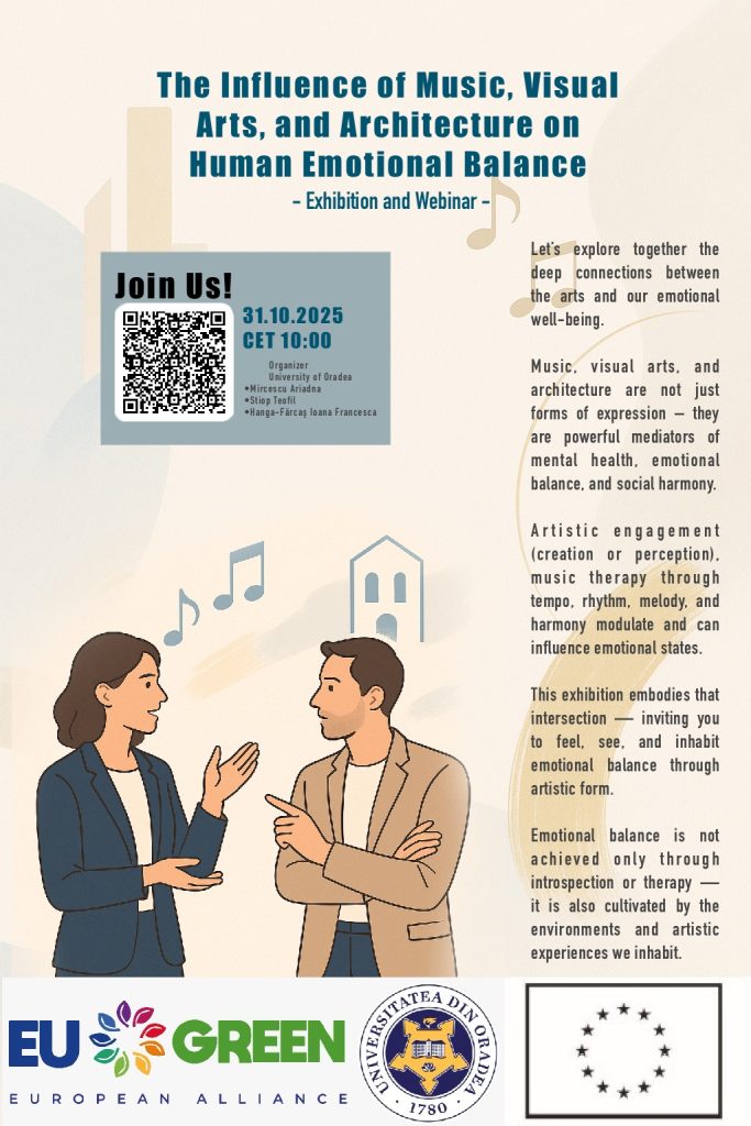 În cadrul seriei de activități inițiate de alianța academică EU GREEN, sub titlul „Împreună pentru Sănătatea Mintală: 9 Tematici, 9 Universități, 9 Motive pentru Acțiune”, Universitatea din Oradea organizează evenimentul „Cum influențează arta stările noastre emoționale și echilibrul interior?”