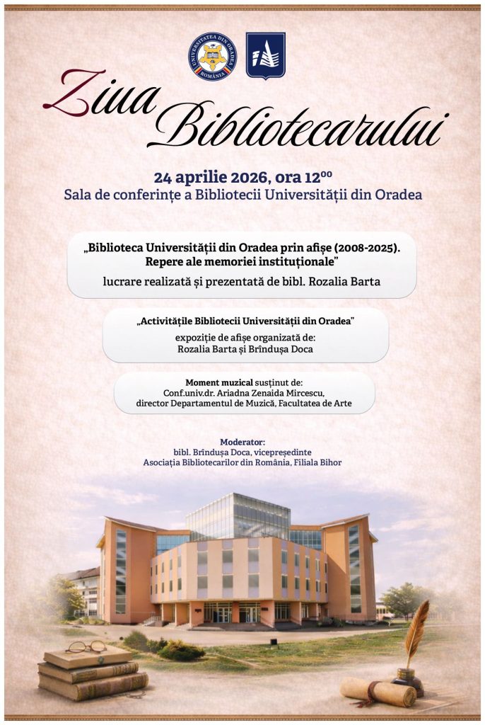Biblioteca Universității din Oradea organizează, vineri, 24 aprilie 2026, ora 12:00, în Sala de conferințe, cu ocazia Zilei Bibliotecarului evenimentul „Biblioteca Universității din Oradea prin afișe (2008-2025).