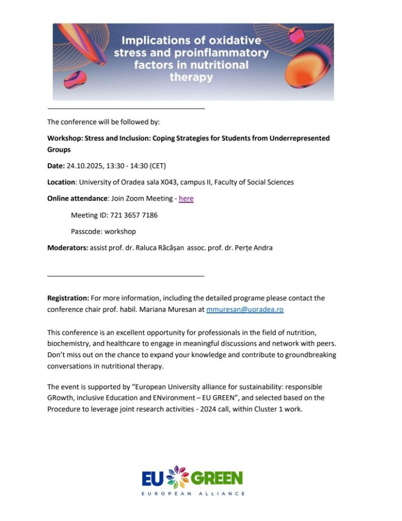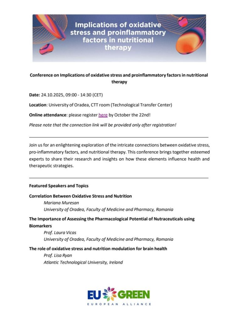 Conferința va explora relația complexă dintre stresul oxidativ, inflamație și nutriție, reunind experți din universitățile membre ale alianței EU GREEN și din afara acesteia. „Vă invităm la explorarea legăturilor complexe dintre stresul oxidativ, factorii proinflamatori și terapia nutrițională. Această conferință reunește experți renumiți pentru a-și împărtăși cercetările și perspectivele despre modul în care aceste elemente influențează sănătatea și strategiile terapeutice. Evenimentul este organizat, în cadrul proiectului EU Green Alliance, de echipa de clusterului de cercetare 1, dedicat noilor paradigme în sănătate și bunăstare, pachetul de lucru WP 3, în colaborare cu pachetele de lucru WP 7 și WP 8”, precizează organizatorii. Coordonatorul științific al conferinței este prof. univ. dr. habil. Mariana Mureșan. Vor lua cuvântul invitați de la: Atlantic Technological University (IRL), Universitatea din Évora (PT), Universitatea din Debrețin (HU), Universitatea de Medicină și Farmacie, Cluj-Napoca (RO).