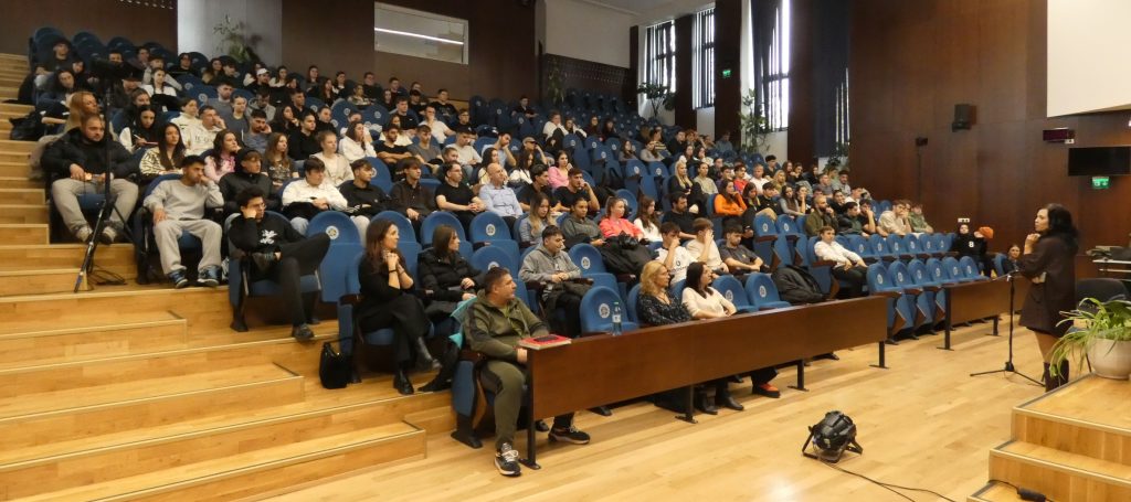 Răspunzând unei provocării la meditație, lansată de profesorul lor conf. univ. dr. Anca Sabău, studenții Facultății de Geografie, Turism și Sport (FGTS), au umplut luni – 17 noiembrie 2025, Aula Magna a Universității din Oradea. Cei aproape 200 de tineri spectatori au urmărit, cu sufletul la gură, reprezentația teatrală „Extaz”, pusă în scenă de actorii trupei orădene „DeLear”.