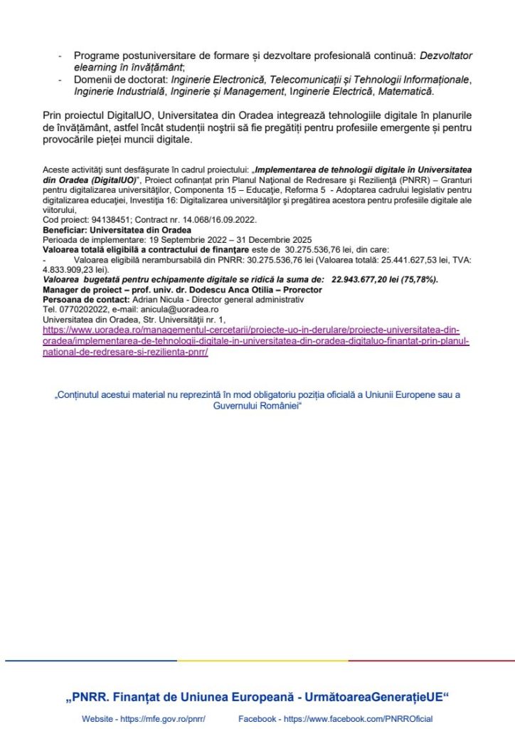 Aceste activităţi sunt desfăşurate în cadrul proiectului: „Implementarea de tehnologii digitale în Universitatea din Oradea (DigitalUO)”, Proiect cofinanțat prin Planul Naţional de Redresare şi Rezilienţă (PNRR) – Granturi pentru digitalizarea universităţilor, Componenta 15 – Educaţie, Reforma 5 – Adoptarea cadrului legislativ pentru digitalizarea educaţiei, Investiţia 16: Digitalizarea universităţilor şi pregătirea acestora pentru profesiile digitale ale viitorului,