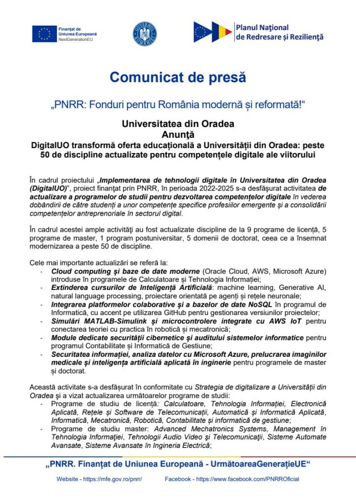 În cadrul proiectului „Implementarea de tehnologii digitale în Universitatea din Oradea (DigitalUO)”, proiect finanţat prin PNRR, în perioada 2022-2025 s-a desfăşurat activitatea de actualizare a programelor de studii pentru dezvoltarea competențelor digitale în vederea dobândirii de către studenți a unor competențe specifice profesiilor emergente și a consolidării competențelor antreprenoriale în sectorul digital.