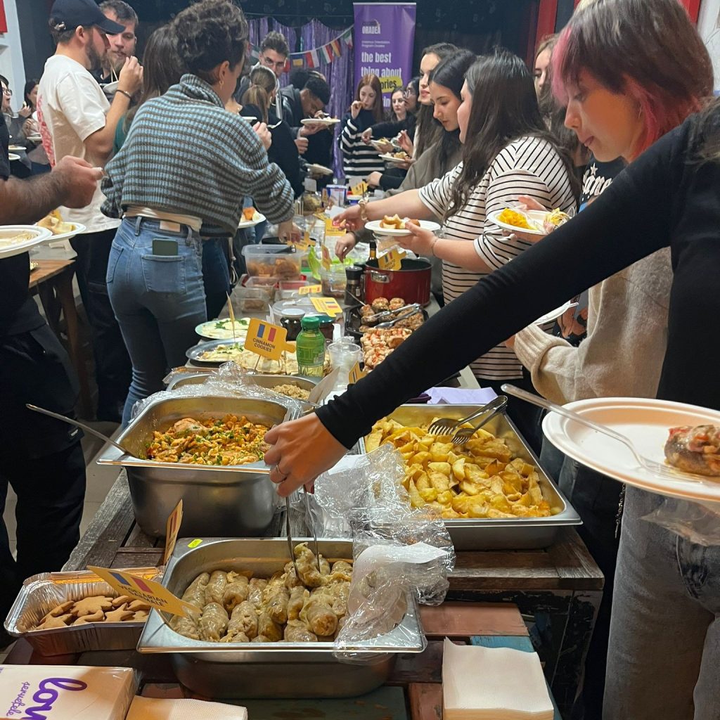Câteva zeci de studenți străini, veniți la Universitatea din Oradea prin intermediul programelor Erasmus, au savurat împreună, marți – 28 octombrie 2025, preparate din bucătăria românească și din țările lor de origine. „Studenți din: Turcia, Italia, Portugalia, Republica Capului Verde, India, Tanzania, Ungaria și Republica Moldova, au gătit ca la ei acasă, alături de colegii lor români de la Universitatea din Oradea”, explică Oana Bonchiș, referent de specialitate, unul din organizatorii evenimentului. Apoi, reprezentanții fiecărei țări le-au vorbit participanților despre preparatele tradiționale și despre cum se mănâncă delicatesele pregătite de ei pentru acest veritabil festin intercultural. Și, desigur, în cele din urmă, toți cei prezenți și-au împărțit reciproc din bunătățile înșirate pe mese.