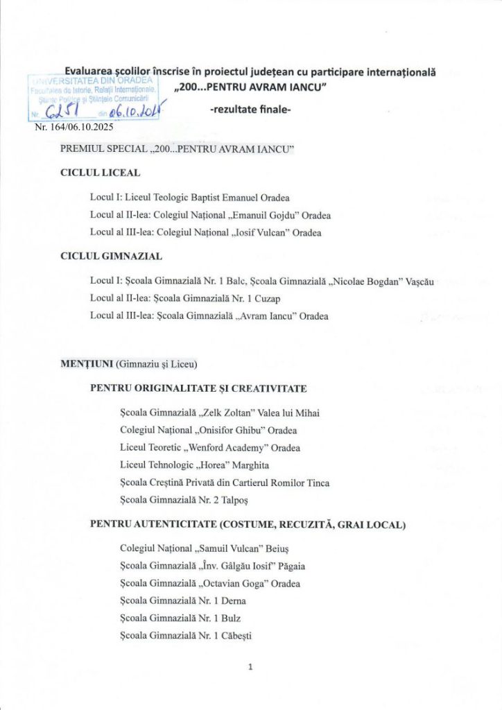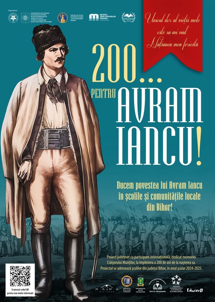 Proiectul județean cu participare internațională „200…PENTRU AVRAM IANCU” a ajuns la final. Desfășurat în anul școlar 2024-2025, proiectul și-a propus să ducă povestea lui Avram Iancu în cât mai multe unități școlare din Județul Bihor, pentru a contribui la popularizarea imaginii Crăișorului Munților în rândul elevilor de gimnaziu și liceu, cu ocazia desfășurării anului 2024 ca „Anul Avram Iancu”, la împlinirea a 200 de ani de la nașterea Eroului Național.