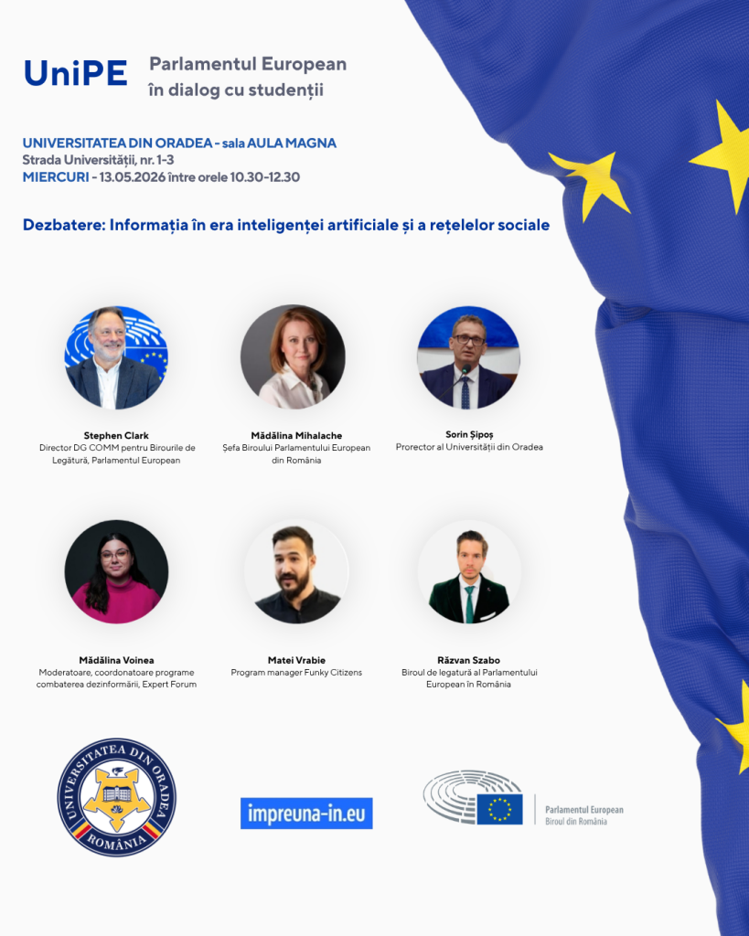 Miercuri, 13 mai, de la orele 10:30, în Aula Magna, Biroul Parlamentului European în România și Universitatea din Oradea vor organiza o dezbatere adresată studenților, cu titlul „Informația în era inteligenței artificiale și a rețelelor sociale”. Evenimentul se va desfășura în limba engleză, dar traducerea va fi asigurată.