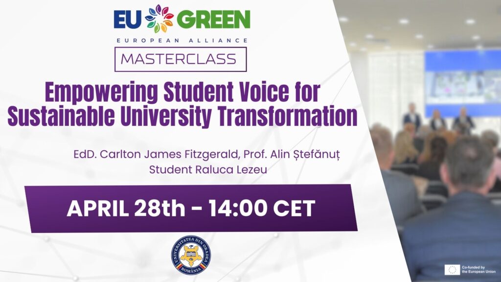 Universitatea din Oradea organizează, în 28 aprilie 2026, de la ora 15:00, masterclass-ul intitulat: Empowering Student Voice for Sustainable University Transformation. Evenimentul are loc sub patronajul alianței academice europene EU GREEN.