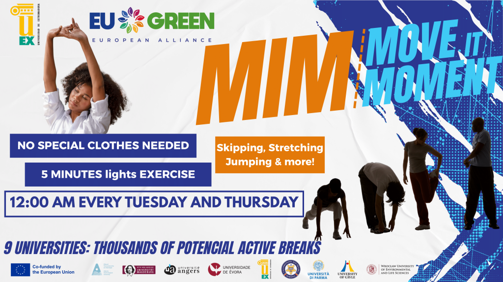 Facultatea de Științe ale Sportului a Universității din Extremadura (Spania) a lansat o provocare tuturor universităților partenere din alianța academică EU GREEN. MIM sau „Move it Moment” este descris de David Sánchez Oliva, unul dintre inițiatori ca fiind: „O activitate scurtă, zilnică, doar 5 minute de mișcare, menită să ne ajute pe toți să integrăm puțină mișcare în rutina noastră, pentru a ne susține bunăstarea fizică și mentală. Este o pauză energizantă, de cinci minute, creată pentru toată lumea, atât personal academic, cât și studenți”.