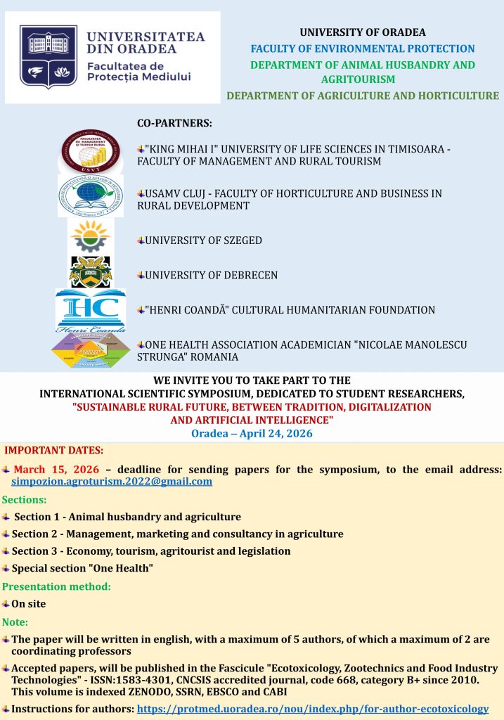 Departamentul de Zootehnie și Agroturism, respectiv Departamentul de Agricultură și Horticultură ale Facultății de Protecția Mediului a Universității din Oradea organizează cea ce a V-a ediție a simpozionului științific internațional cu titlul: „Viitorul rural sustenabil, între tradiție, digitalizare și inteligență artificială”.