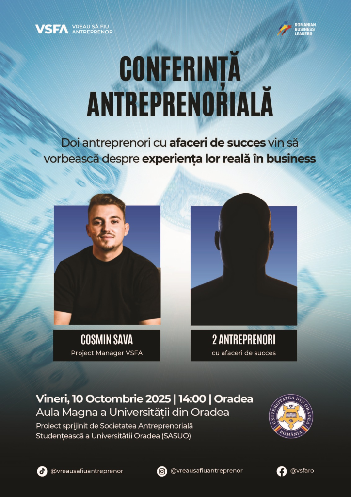 Organizată, vineri – 10 octombrie 2025, de la ora 14:00, în Aula Magna a Universității din Oradea, conferința este un eveniment dedicat tuturor studenților pasionați de inițiativă, care au curaj și idei de business!