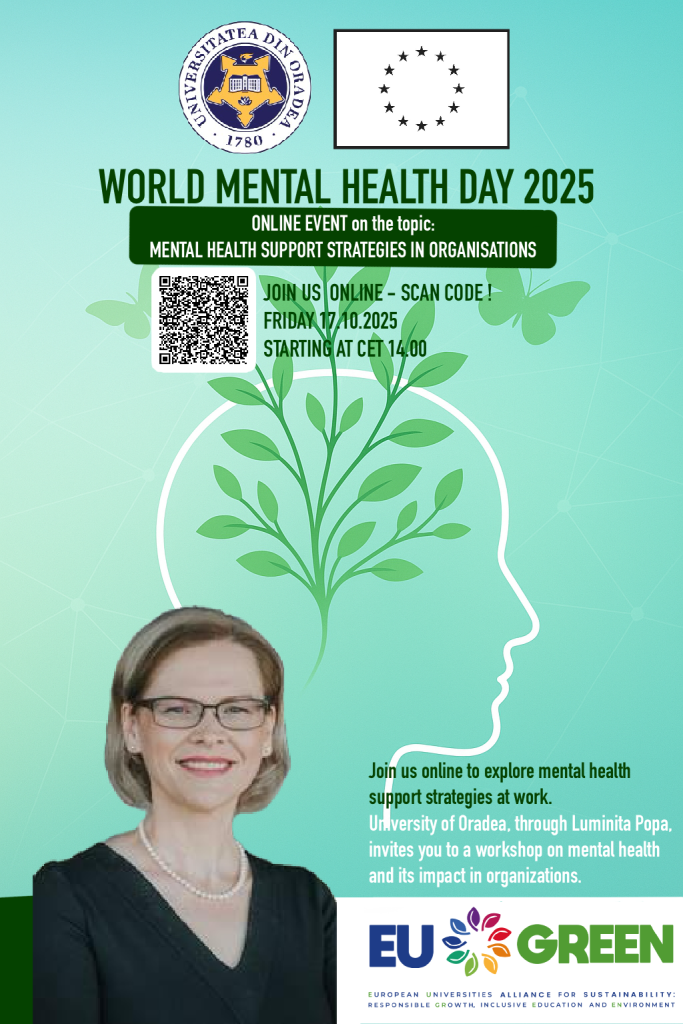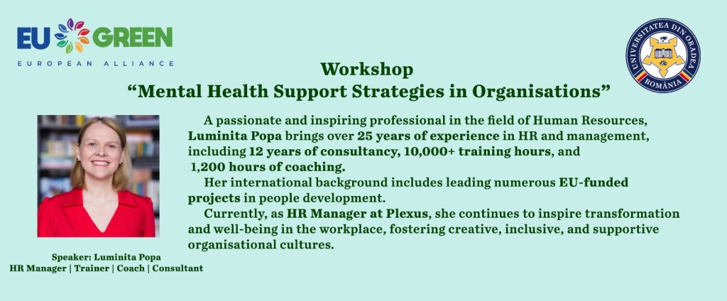 Universitatea din Oradea, în cadrul Alianței EU GREEN, organizează un workshop online dedicat sănătății mintale și bunăstării în organizații, ca parte a activităților din Work Package 8 – Building a Truly Sustainable Campus.